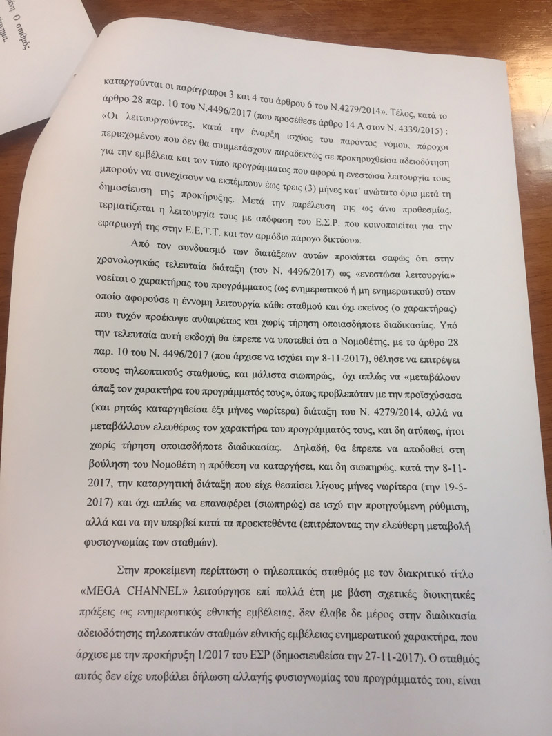 «Ο τηλεοπτικός σταθμός με το διακριτικό τίτλο «MEGA CHANNEL» λειτούργησε επί πολλά έτη με βάση σχετικές διοικητικές πράξεις ως ενημερωτικός σταθμός εθνικής εμβέλειας, δεν έλαβε δε μέρος στη διαδικασία αδειοδότησης τηλεοπτικών σταθμών εθνικής εμβέλειας ενημερωτικού χαρακτήρα, που άρχισε με την προκήρυξη 1/2017 του ΕΣΕ (δημοσιευθείσα την 27-11-2017). Ο σταθμός αυτός δεν είχε υποβάλλει δήλωση αλλαγής φυσιογνωμίας του προγράμματός του, είναι δε κοινώς γνωστό (πανελλήνιο πασίδηλο) ότι από το μήνα Σεπτέμβριο του 2016 διέκοψε τη μετάδοση ειδήσεων και ενημερωτικών προγραμμάτων» αναφέρει το σκεπτικό της απόφασης, προσθέτοντας ότι τα μέλη του ΕΣΡ, κατά πλειοψηφία θεωρούν ότι πρέπει «να αποφασιστεί ο τερματισμός της λειτουργίας του».