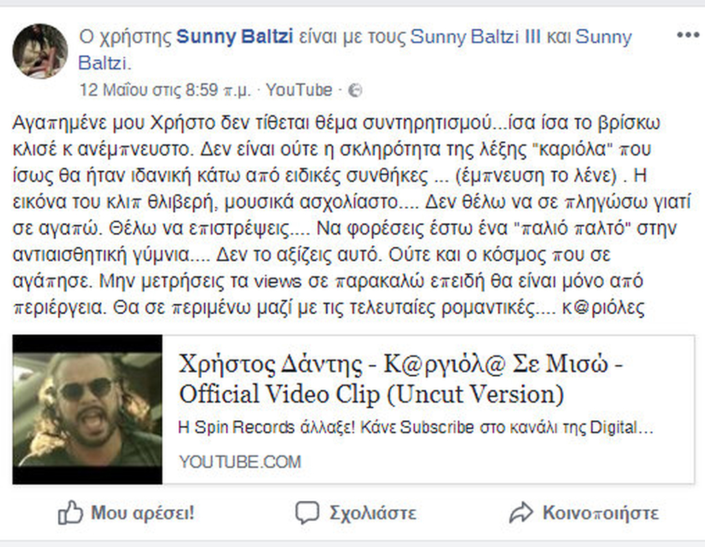 «Αγαπημένε μου Χρήστο δεν τίθεται θέμα συντηρητισμού…ίσα ίσα το βρίσκω κλισέ κ ανέμπνευστο. Δεν είναι ούτε η σκληρότητα της λέξης “καριόλα” που ίσως θα ήταν ιδανική κάτω από ειδικές συνθήκες … (έμπνευση το λένε) . Η εικόνα του κλιπ θλιβερή, μουσικά ασχολίαστο…. Δεν θέλω να σε πληγώσω γιατί σε αγαπώ. Θέλω να επιστρέψεις…. Να φορέσεις έστω ένα “παλιό παλτό” στην αντιαισθητική γύμνια…. Δεν το αξίζεις αυτό. Ούτε και ο κόσμος που σε αγάπησε. Μην μετρήσεις τα views σε παρακαλώ επειδή θα είναι μόνο από περιέργεια. Θα σε περιμένω μαζί με τις τελευταίες ρομαντικές…. κ@ριόλες», έγραψε.
