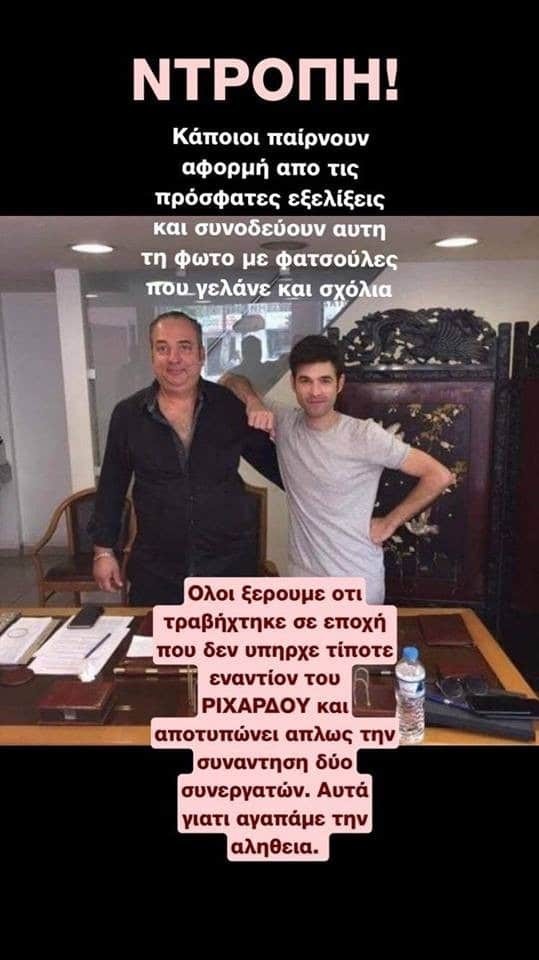 «Ντροπή! Κάποιοι παίρνουν αφορμή από τις πρόσφατες εξελίξεις και συνοδεύουν τη φώτο με φατσούλες που γελάνε και σχόλια. Όλοι ξέρουμε ότι τραβήχτηκε σε εποχή που δεν υπήρχε τίποτε ενώπιον του Ριχάρδου και αποτυπώνει απλώς τη συνάντηση δύο συνεργατών. Αυτά γιατί αγαπάμε την αλήθεια.»