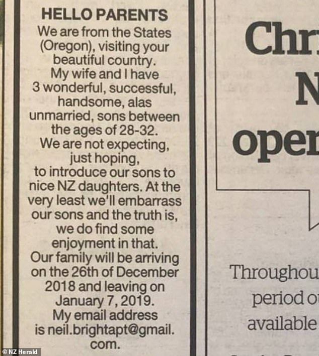 «Γεια σας γονείς. Είμαστε από την Αμερική (το Όρεγκον) και επισκεπτόμαστε την όμορφη χώρα σας. Η γυναίκα μου κι εγώ έχουμε τρεις υπέροχους, πετυχημένους, όμορφους, αλλά δυστυχώς άγαμους γιους ηλικίας 28-32 ετών» αναφέρει η αγγελία.