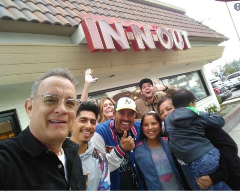 Ο ηθοποιός και η σύζυγός του Ρίτα Γουίλσον βρέθηκαν σε εστιατόριο fast food στην Καλιφόρνια για να φάνε. Εκεί, απόλαυσαν το γεύμα τους και φωτογραφήθηκαν με όποιον τους το ζητούσε. Στο τέλος ο Τομ Χανκς κέρασε όλο το μαγαζί, πληρώνοντας τα γεύματά τους.