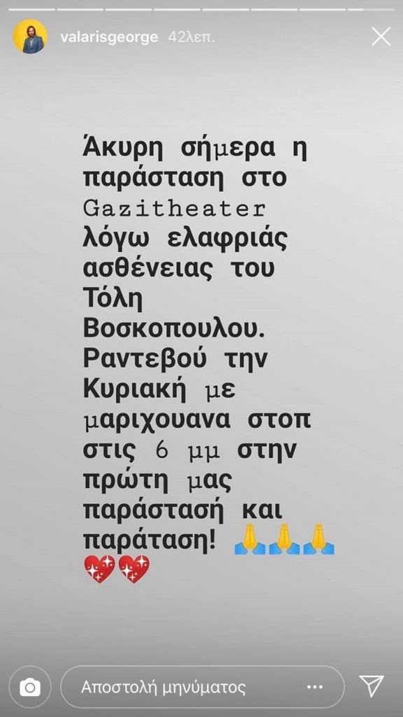 Ανησυχία προκάλεσε η αναβολή της χθεσινής παράστασης του μιούζικαλ «Μαριχουάνα Stop!«, λόγω προβλήματος υγείας του Τόλη Βοσκόπουλου. Ο σκηνοθέτης του έργου, Γιώργος Βάλαρης, ενημέρωσε με instastory ότι ο «πρίγκιπας της νύχτας» έχει μια ελαφριά ασθένεια, όχι κάτι σοβαρό, και ότι η παράσταση θα παιχτεί κανονικά την Κυριακή. Ωστόσο, οι χιλιάδες θαυμαστές του κορυφαίου Έλληνα βάρδου καρδιοχτύπησαν και θέλησαν να μάθουν περισσότερα.