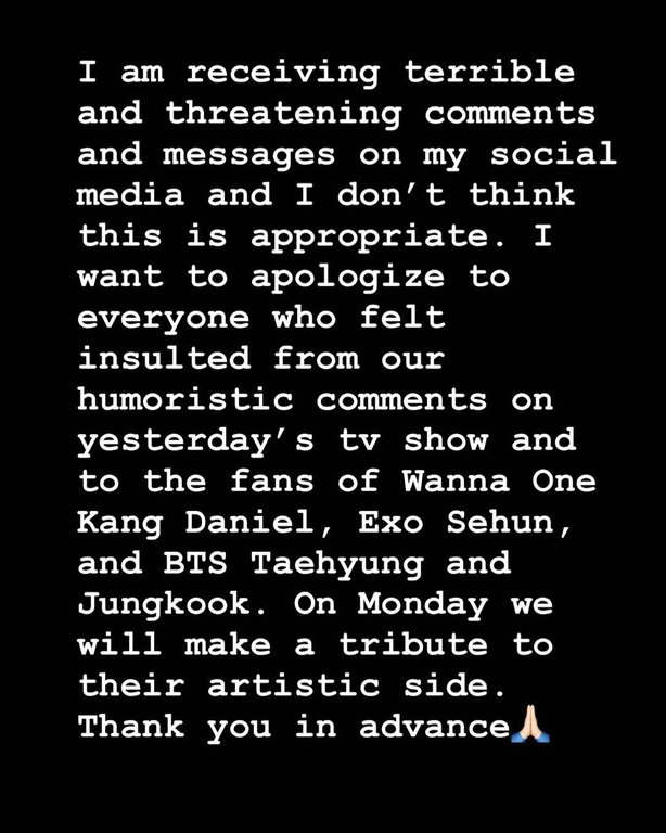 «Ο σεβασμός της κουλτούρας κάθε λαού, είναι αδιαμφισβήτητος και αποτελεί μια από τις αρχές μου. Όπως επίσης και η στήριξη και αποδοχή κάθε διαφορετικότητας που ποτέ δεν αντιμετώπισα ως κάτι λανθασμένο ή κακό. Αντίθετα μάλιστα τόσο στη δημόσια όσο και στην ιδιωτική ζωή μου, παλεύω καθημερινα για το αντίθετο. Το να σχολιάσω χιουμοριστικά μια «λίστα» με ωραίους άνδρες στο πλαίσιο θέματος της εκπομπής που παρουσιάζω, δεν αμφισβητεί την καλλιτεχνική αξία του συγκροτήματος BTS, ή κανενός άλλου.