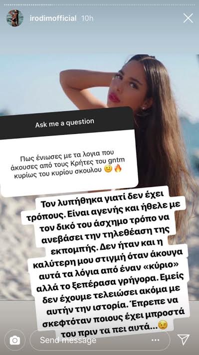 Πιο συγκεκριμένα, στην ερώτηση: «Πως ένιωσες με τα λόγια που άκουσες από τους κριτές του GNTM; Κυρίως του κυρίου Σκουλού», απάντησε: «Τον λυπήθηκα γιατί δεν έχει τρόπους. Είναι αγενής και ήθελε με τον δικό του άσχημο τρόπο να ανεβάσει την τηλεθέαση της εκπομπής. Δεν ήταν και η καλύτερη μου στιγμή όταν άκουγα αυτά τα λόγια από έναν «κύριο» αλλά το ξεπέρασα γρήγορα. Εμείς δεν έχουμε τελειώσει ακόμα με αυτήν την ιστορία. Έπρεπε να σκεφτόταν ποιους έχει μπροστά του πριν τα πει αυτά….».