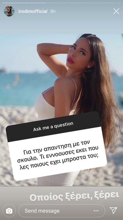 Μάλιστα, στη συνέχεια σε ερώτηση: «Για την απάντηση με τον Σκουλό. Τι εννοούσες εκεί που λες ποιούς έχει μπροστά του;», εκείνη απάντησε: «Όποιος ξέρει, ξέρει».