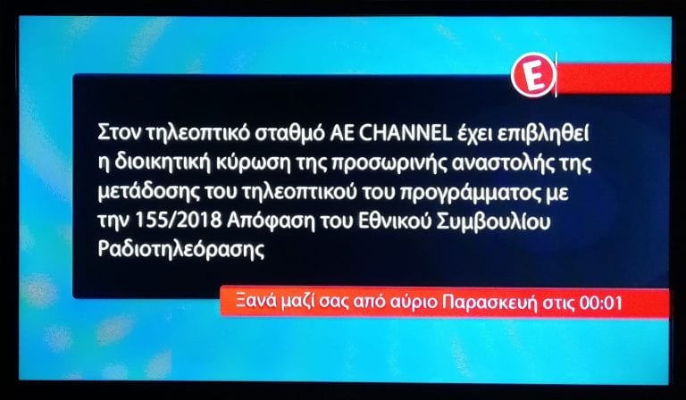 -Την “ηθική κύρωση της μετάδοσης “αδιαλείπτως από τις 00.01 έως και τις 24.00 της 10ης Ιανουαρίου 2019 ευκρινή κάρτα” η οποία θα αναφέρει τα εξής:: «Στον τηλεοπτικό σταθμό AE CHANNEL έχει επιβληθεί η διοικητική κύρωση της προσωρινής αναστολής της μετάδοσης του τηλεοπτικού του προγράμματος με την 155/2018 Απόφαση του Εθνικού Συμβουλίου Ραδιοτηλεόρασης».