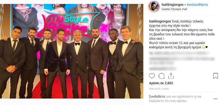 «Ένας σούπερ τελικός έρχεται στο my style rocks ! Και την απόφαση θα την πάρετε εσείς live τη βραδιά του τελικού που θα είμαστε πάλι όλοι εκεί !Φωτό τύπου ocean 11 και μια ωραία καλημέρα αυτή τη βροχερή ημέρα», σχολίασε στην επίμαχη φωτογραφία.