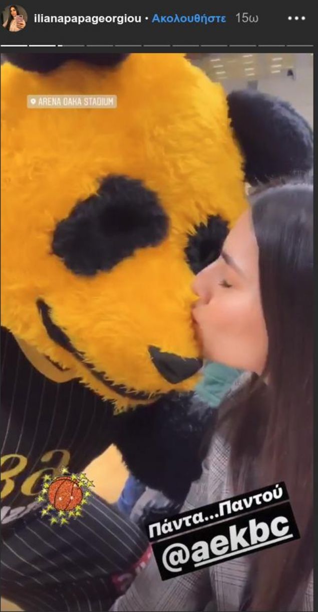 Οι δυο τους δεν παρέλειψαν να βγάλουν instastories από την προσπάθεια της ΑΕΚ, ενώ σε ένα από αυτά η Ηλιάνα Παπαγεωργίου δίνει φιλί στην μασκότ της ΑΕΚ, Panda Pandou. «Πάντα… παντού», έγραψε το μοντέλο κάνοντας mention τον λογαριασμό της ΑΕΚ.