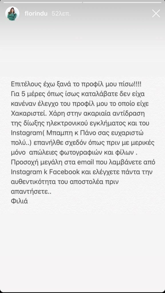 Ειδικότερα, έγραψε: «Επιτέλους έχω ξανά το προφίλ μου πίσω! Για πέντε μέρες όπως ίσως καταλάβατε δεν είχα κανέναν έλεγχο του προφίλ μου, το οποίο είχε χακαριστεί. Χάρη στην ακαριαία αντίδραση της δίωξης ηλεκτρονικού εγκλήματος και του Instagram, επανήλθε σχεδόν όπως πριν με μερικές απώλειες φωτογραφιών και φίλων. Προσοχή μεγάλη στα email που λαμβάνεται από Instagram και Facebook και ελέγχετε πάντα την αυθεντικότητα του αποστολέα πριν απαντήσετε. Φιλιά», έγραψε.