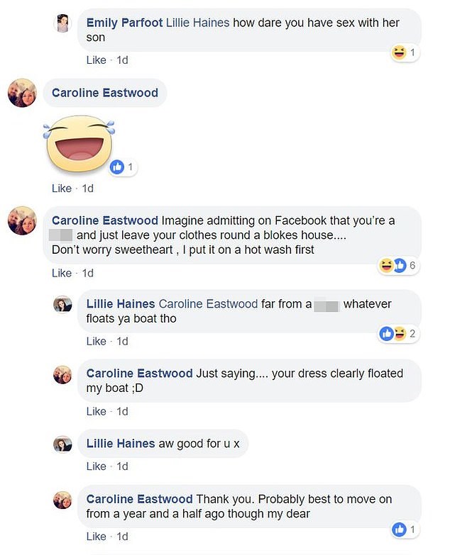 “Ημασταν για λίγο καιρό μαζί, κάτι σαν φίλοι με προνόμια” είπε η Λίλι Χέινς από το Χαμφσάιρ εξηγώντας πώς άφησε το φόρεμά της στην κρεβατοκάμαρά του. Η Καρολάιν Ίστγουντ ειρωνεύτηκε τη Λίλι λέγοντας ότι μάλλον ζηλεύει που καταφέρνει αν και σχεδόν 20 χρόνια μεγαλύτερή της να φορά το ίδιο φόρεμα και μάλιστα να της πηγαίνει καλύτερα απ’ ό,τι στην ίδια τη Λίλι, η οποία έγινε μπαρούτι και της απάντησε ότι ενώ φορούσε αυτό το φόρεμα είχε κάνει έρωτα με τον γιο της. Η κόντρα συνεχίστηκε με βαριές εκφράσεις εκατέρωθεν.