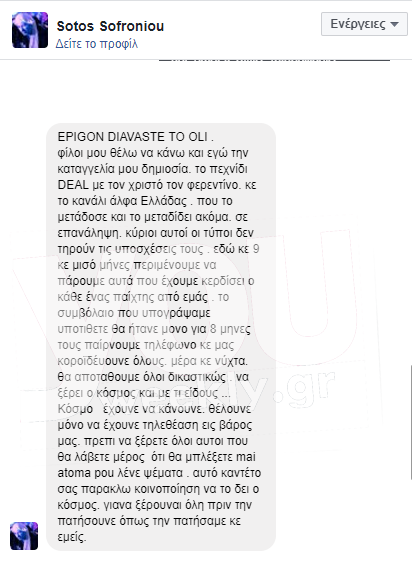 «Φίλοι μου θέλω να κάνω και εγώ την καταγγελία μου. Το παιχνίδι DEAL με τον Χρήστο Φερεντίνο και το κανάλι Άλφα Ελλάδας, που το μετέδωσε και το μεταδίδει ακόμα σε επανάληψη, κύριοι αυτοί οι τύποι δεν τηρούν τις υποσχέσεις τους . Εδώ και 9 και μισό μήνες περιμένουμε να πάρουμε αυτά που έχουμε κερδίσει ο κάθε ένας παίχτης από εμάς . Το συμβόλαιο που υπογράψαμε υποτίθεται θα ήταν μόνο για 8 μήνες! Τους παίρνουμε τηλέφωνο και μας κοροϊδέυουνε όλους, μέρα και νύχτα. Θα αποταθούμε όλοι δικαστικώς . Να ξέρει ο κόσμος και με τι είδους … Κόσμο έχουνε να κάνουνε. Θέλουνε μόνο να έχουνε τηλεθέαση εις βάρος μας. Πρέπει να ξέρετε όλοι αυτοί που θα λάβετε μέρος ότι θα μπλέξετε με άτομα που λένε ψέματα . Αυτό καντέ το σας παρακαλω κοινοποίηση να το δει ο κόσμος. για να ξέρουν όλοι πριν την πατήσουν όπως την πατήσαμε κι εμείς!»