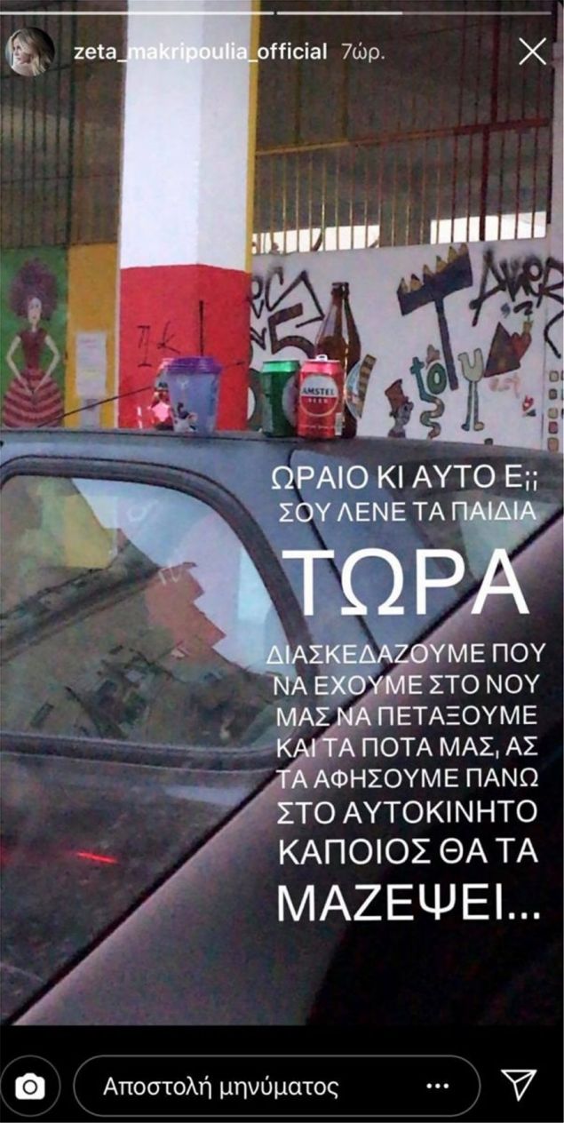 Η Ζέτα έγραψε χαρακτηριστικά δημοσιεύοντας τη φωτογραφία που τράβηξε από το εν λόγω όχημα: «Ωραίο και αυτό ε; Σου λένε τα παιδιά τώρα διασκεδάζουμε που να έχουμε στο νου μας να πετάξουμε και τα ποτά μας, ας τα αφήσουμε πάνω στο αυτοκίνητο. Κάποιος θα τα μαζέψει…».