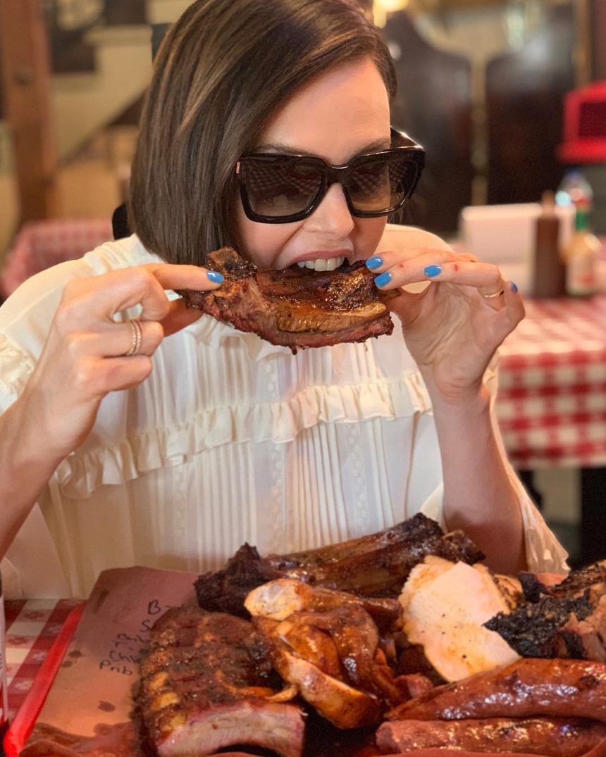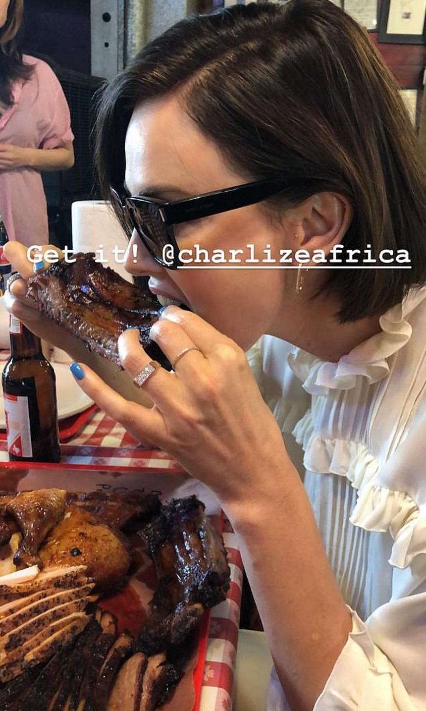 Η Νοτιοαφρικανή ηθοποιός μοιράστηκε με τους θαυμαστές της κάποια αστεία στιγμιότυπα στο Instagram από το ταξίδι της εκεί, δείχνοντας τους πόσο ωραία τα περνάει. Συγκεκριμένα ανέβασε μία φωτογραφία από το barbeque που είχαν, που την δείχνει να έχει μπροστά της ένα τεράστιο πιάτο με κρέατα και αυτή να έχει βάλει στο στόμα της ένα παϊδάκι και να το τρώει με τα χέρια. «Austin, σ αγαπώ» ήταν το σχόλιο που συνόδευε την φωτογραφία της ενώ και οι φίλοι της κοινοποίησαν κάποιες παρόμοιες αστείες φωτογραφίες.