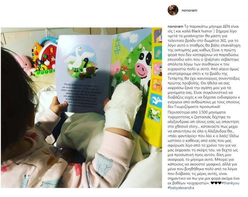 «Το παρακάτω μήνυμα ΔΕΝ είναι ιός (και καλά Black humor) Σήμερα λίγο «μετά τα μεσάνυχτα» θα ‘μαστε για τελευταίο βράδυ στο δωμάτιο 361, για το λόγο αυτό ο σταθμός θα βάλει επανάληψη της εκπομπής μας καθώς είναι η πρώτη φορά που δεν καταφέρνω να παραδώσω επεισόδιο κάτι που ο Alpha σεβάστηκε απόλυτα λόγω των συνθηκών κ τον ευχαριστώ πολύ γι αυτό. Από αύριο όμως επιστρέφουμε σπίτι κ το βράδυ της Τετάρτης θα έχει καινούργιες συνεντεύξεις πρώτης προβολής. Θα ήθελα να σας εκφράσω ξανά την αγάπη μου για τα μηνύματα σας. Είναι συγκλονιστικό να διαβάζεις ευχές κ να δέχεσαι ενδιαφέρον κ ενέργεια από ανθρώπους με τους οποίους δεν Γνωριζόμαστε προσωπικά! Περισσότερα από 3,500 μηνύματα τρυφερότητας κ ζεστασιάς δέχτηκε το Aλεξανδράκι απ όλους εσάς ως απάντηση στο χθεσινό story… κατανοείτε πως μέχρι να απαντήσω σε όλα η Αλεξάνδρα θα… «πάει φαντάρος» που λέει κ ο λαός! Θέλω ωστόσο ο καθένας από εσάς που μας αφιέρωσε λίγο από το χρόνο του για να μας εκφράσει τη σκέψη του, να δεχτεί ως μια προσωπική προς αυτόν, δίκη μου αναφορά, το μήνυμα αυτό. Μπορεί για κάποιους να ακουστεί γραφικό, αλλά για μένα που βοηθήθηκα πολύ από τα λόγια που διάβασα, τις μέρες αυτές, είναι σημαντικό να πω για μια φορά ακόμα ένα εκ βαθέων «ευχαριστώ». #thankyou #babyalexandra» , έγραψε χαρακτηριστικά στη λεζάντα που την συνόδευε.