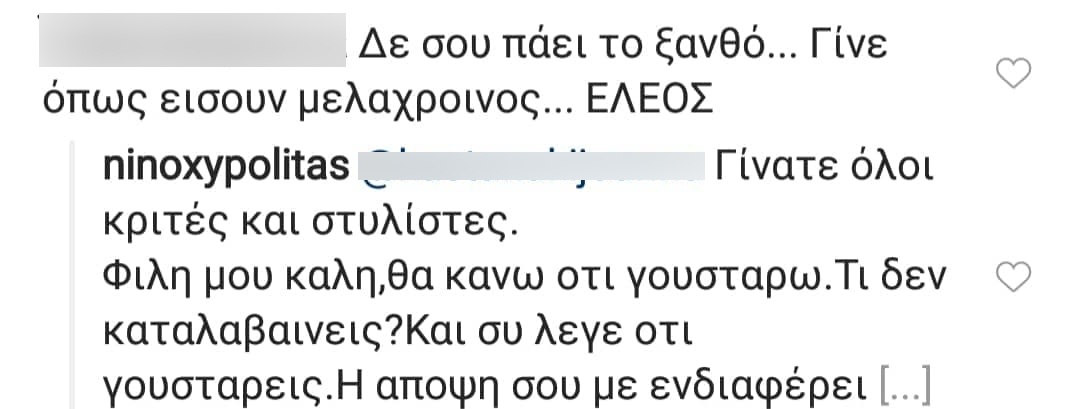 Ο διάλογος ήταν ο εξής: «Δε σου πάει το ξανθό… Γίνε όπως ήσουν μελαχρινός… Έλεος»! Για να πάρει την εξής απάντηση από τον τραγουδιστή: » Γίνατε όλοι κριτές και στυλίστες. Φίλη μου καλή θα κάνω ότι γουστάρω. Τι δεν καταλαβαίνεις; Και συ λέγε ότι γουστάρεις… Η άποψή σου με ενδιαφέρει…..