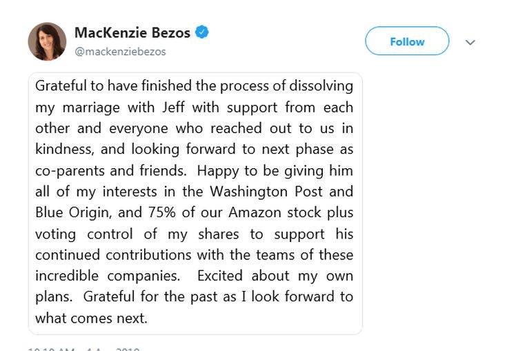 «Με χαρά του δίνω όλα μου τα συμφέροντα στην Washington Post και την Blue Origin και το 75% των μετοχών μας στην Amazon, συν τα δικαιώματα ψήφου των μετοχών μου για να στηρίξω τις συνεχιζόμενες συνεισφορές του στις ομάδες αυτών των απίστευτων εταιρειών. Είμαι ενθουσιασμένη για τα δικά μου σχέδια. Είμαι ευγνώμων για το παρελθόν, καθώς αναμένω τι πρόκειται να έρθει», σημείωσε.