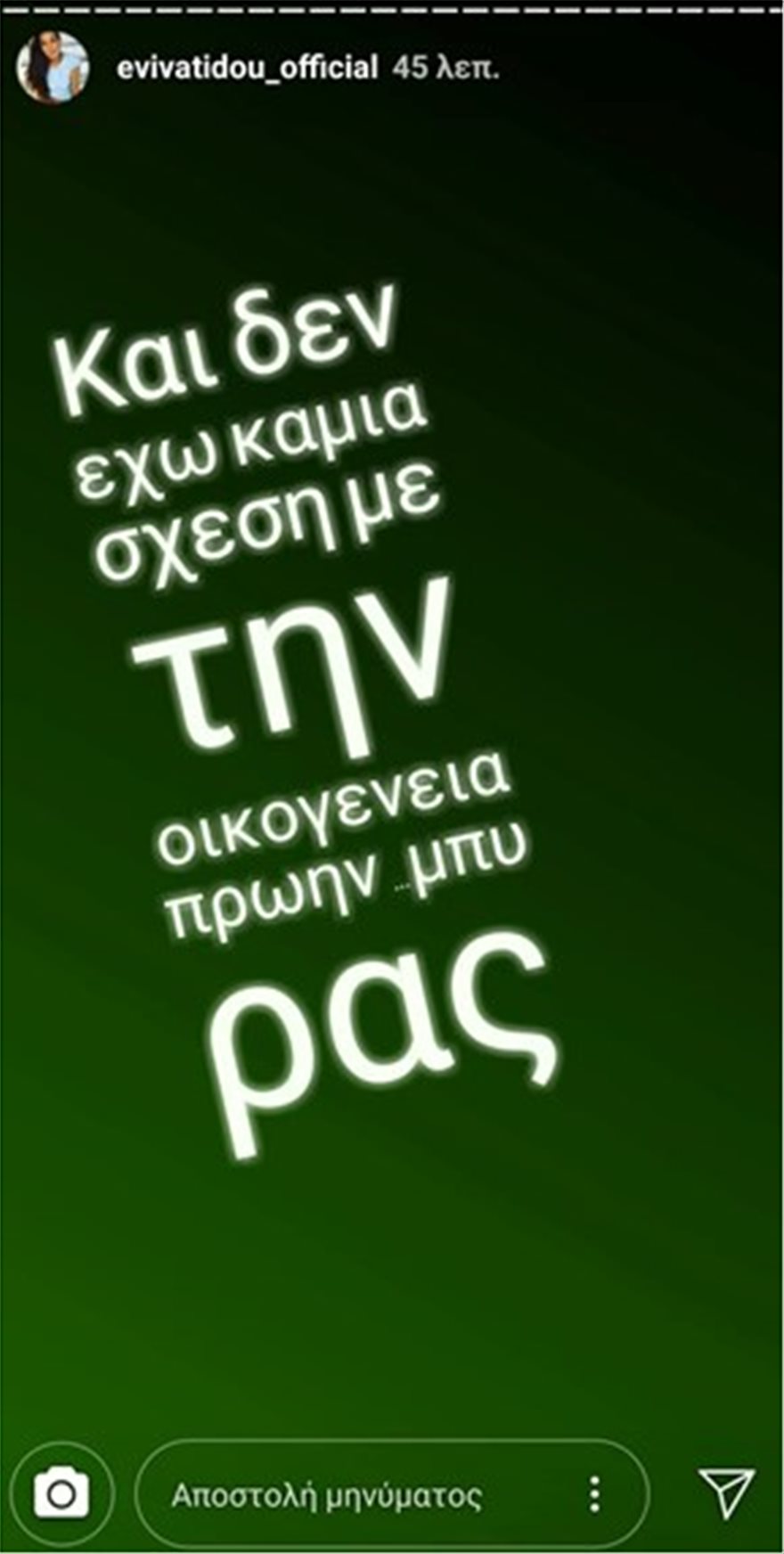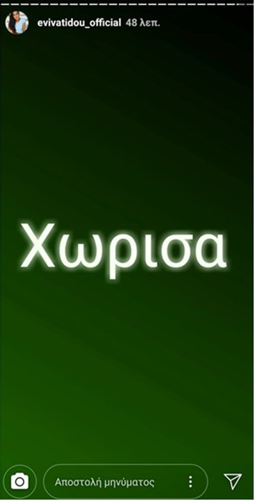 «Χώρισα και δεν έχω καμία σχέση με την οικογένεια πρώην… μπίρας. Απλά επειδή στο παρελθόν πάλι είχα χωρίσει, όπως λανθασμένα πήρατε θάρρος, ξέρετε εσείς, δημόσια ανακοινώνω τον χωρισμό με την πρώην σχέση μου». Και με ένα ακόμα story συμπλήρωσε: «Όταν χωρίζεις απλά πρέπει να είσαι ευτυχισμένος για τα καλύτερα»