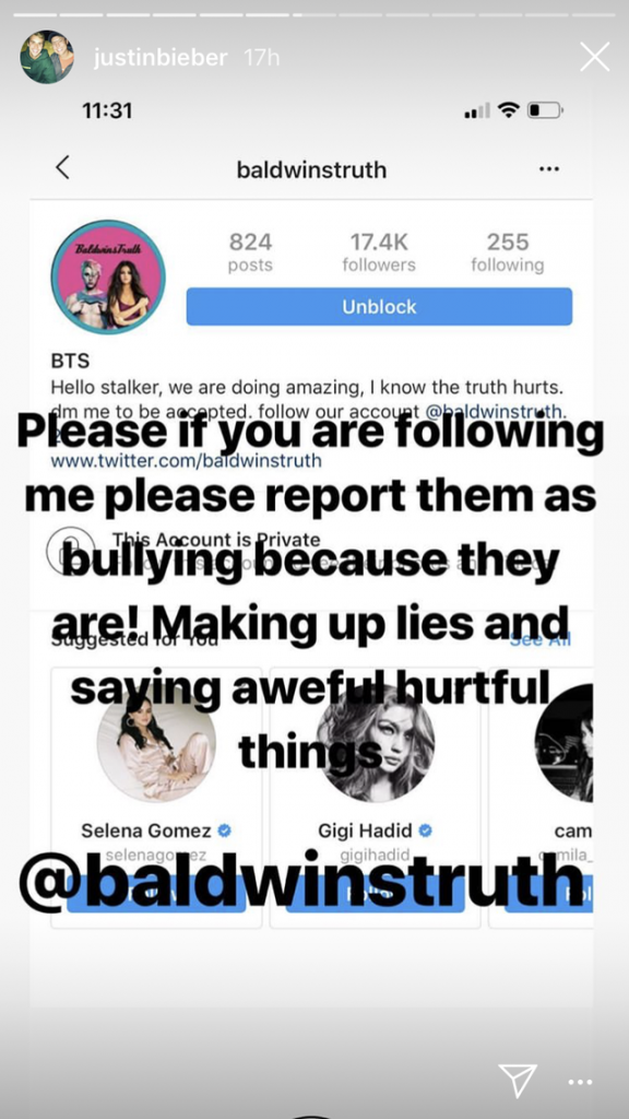 Άθελά του o Justin Bieber μας έδειξε κάτι που ίσως δεν έπρεπε να δούμε… Όπως μπορείτε να δείτε στο screenshot που ανέβασε με τον λογαριασμό, που μάς καλεί να κάνουμε report, φαίνονται οι λογαριασμοί που τού προτείνει το Instagram να ακολουθήσει.