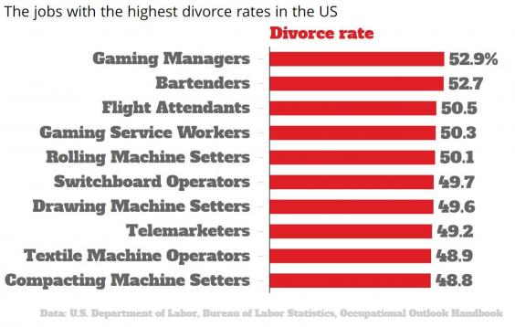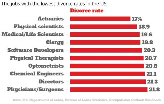 Μια έρευνα της American Community Survey μέτρησε τη συχνότητα διαζυγίων ανά επάγγελμα στην Αμερική (περιμένουμε μια ανάλογη έρευνα και για την Ελλάδα).