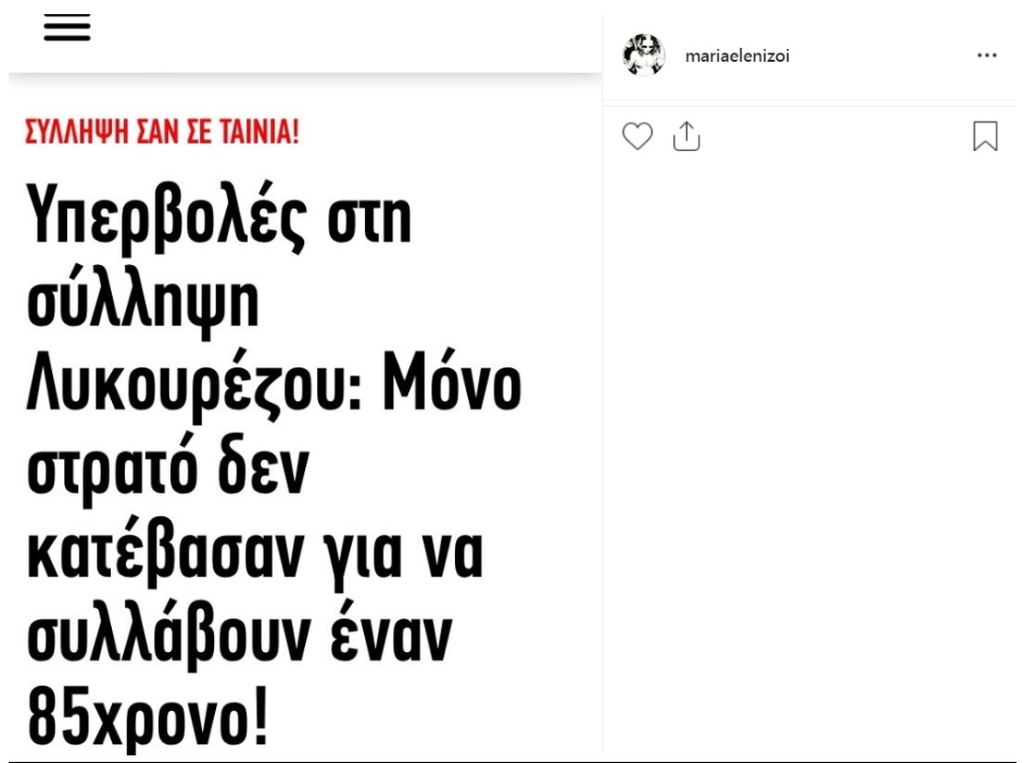 Κι ενώ οι δύο δικηγόροι θα περάσουν το Σαββατοκύριακο στα κρατητήρια της Γενικής Αστυνομικής Διεύθυνσης Αττικής, αφού έλαβαν προθεσμία από τον εφέτη ειδικό ανακριτή για να απολογηθούν τη Μεγάλη Δευτέρα, η Μαρία Ελένη Λυκουρέζου έκανε μια νέα ανάρτηση στο Instagram σχετικά με την προσαγωγή του πατέρας της. Συγκεκριμένα, δημοσίευσε στον προσωπικό της λογαριασμό στο Instagram screenshot του τίτλου ενός θέματος που γράφτηκε στο διαδίκτυο και στον οποίο περιγράφεται πώς έγινε η σύλληψη. «Υπερβολές στη σύλληψη Λυκουρέζου: Μόνο στρατό δεν κατέβασαν για να συλλάβουν έναν 85χρονο!», ανέφερε χαρακτηριστικά.