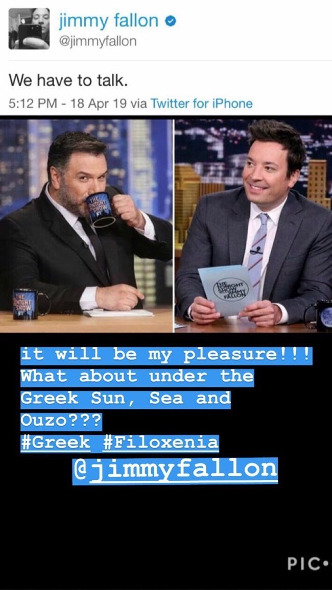 Ο Γρηγόρης Αρναούτογλου θέλησε να απαντήσει στον Τζίμι Φάλον μέσω του Instagram. Πιο συγκεκριμένα, ανέβασε ένα story με τους δυο τους και έγραψε: «Θα ήταν ευχαρίστηση μου να συναντηθούμε. Τι λες για κάτω από τον ελληνικό ήλιο, τη θάλασσα και το ούζο;».