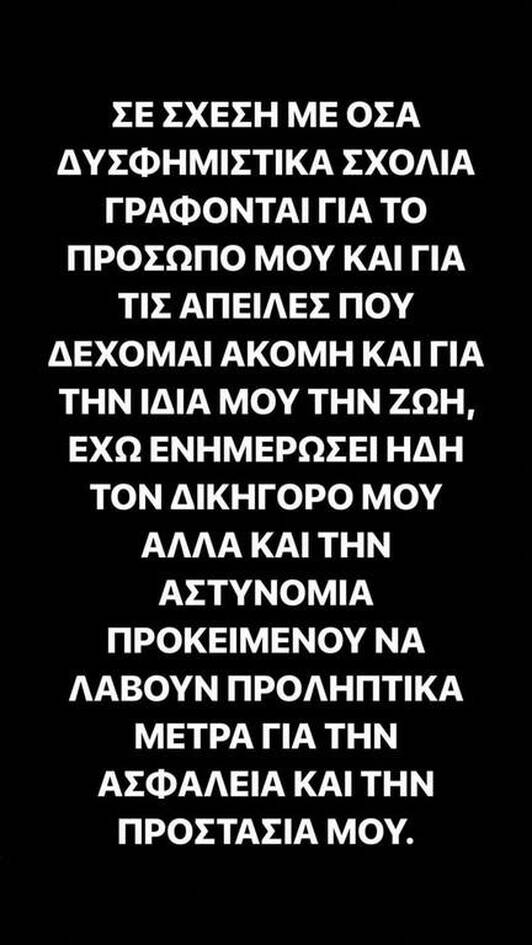 «Σε σχέση με όσα δυσφημιστικά σχόλια γράφονται για το πρόσωπό μου και για τις απειλές που δέχομαι ακόμη για τη ζωή, έχω ενημερώσει ήδη τον δικηγόρο μου αλλά και την αστυνομία, προκειμένου να λάβουν προληπτικά μέτρα για την ασφάλεια και την προστασία μου», έγραψε η παίκτρια του Power of Love.