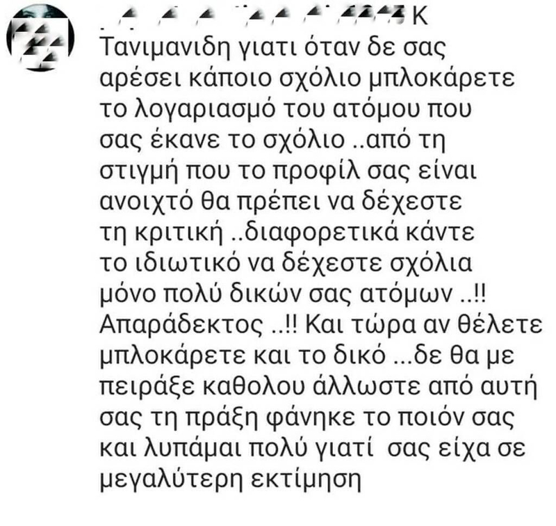 «Κύριε Τανιμανίδη γιατί όταν δε σας αρέσει κάποιο σχόλιο μπλοκάρετε το λογαριασμό του ατόμου που σας έκανε το σχόλιο ..από τη στιγμή που το προφίλ σας είναι ανοιχτό θα πρέπει να δέχεστε τη κριτική ..διαφορετικά κάντε το ιδιωτικό να δέχεστε σχόλια μόνο πολύ δικών σας ατόμων ..!! Απαράδεκτος ..!! Και τώρα αν θέλετε μπλοκάρετε και το δικό …δε θα με πειράξει καθόλου άλλωστε από αυτή σας τη πράξη φάνηκε το ποιόν σας και λυπάμαι πολύ γιατί σας είχα σε μεγαλύτερη εκτίμηση», έγραψε.