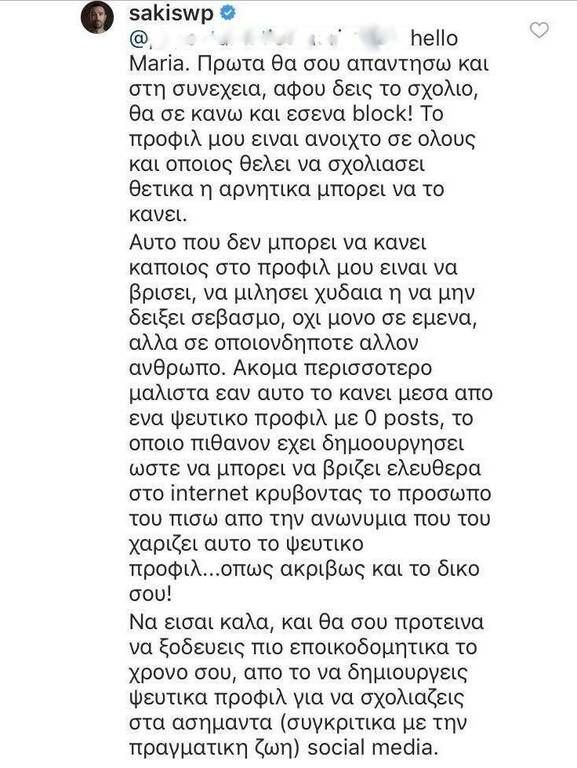 «Πρώτα θα σου απαντήσω και στη συνέχεια, αφού δεις το σχόλιο, θα σε κάνω και εσένα block! Το προφίλ μου είναι ανοιχτό σε όλους και όποιος θέλει να σχολιάσει θετικά η αρνητικά μπορεί να το κάνει. Αυτό που δεν μπορεί να κάνει κάποιος στο προφίλ μου είναι να βρίσει, να μιλήσει χυδαία ή να μην δείξει σεβασμό, όχι μόνο σε εμένα, αλλά σε οποιονδήποτε άλλον άνθρωπο. Ακόμα περισσότερο μάλιστα εάν αυτό το κάνει μέσα από ένα ψεύτικο προφίλ με 0 posts, το οποίο πιθανόν έχει δημιουργήσει ώστε να μπορεί να βρίζει ελεύθερα στο internet κρύβοντας το πρόσωπο του πίσω από την ανωνυμία που του χαρίζει αυτό το ψεύτικο προφίλ… όπως ακριβώς και το δικό σου! Να είσαι καλά, και θα σου πρότεινα να ξοδεύεις πιο εποικοδομητικά το χρόνο σου, από το να δημιουργείς ψεύτικα προφίλ για να σχολιάζεις στα ασήμαντα (συγκριτικά με την πραγματική ζωή) social media», σημείωσε ο Σάκης Τανιμανίδης.