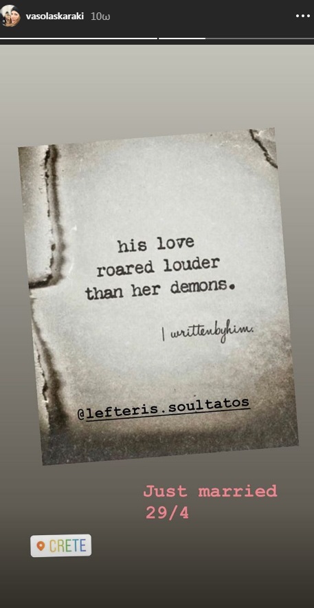 Η Βάσω Λασκαράκη επιβεβαίωσε το γεγονός μέσα από τον λογαριασμό της στο Instagram. Η ηθοποιός ανέβασε ένα story – μήνυμα στον Λευτέρη Σουλτάτο και έγραψε: «Just Married 29/4»…