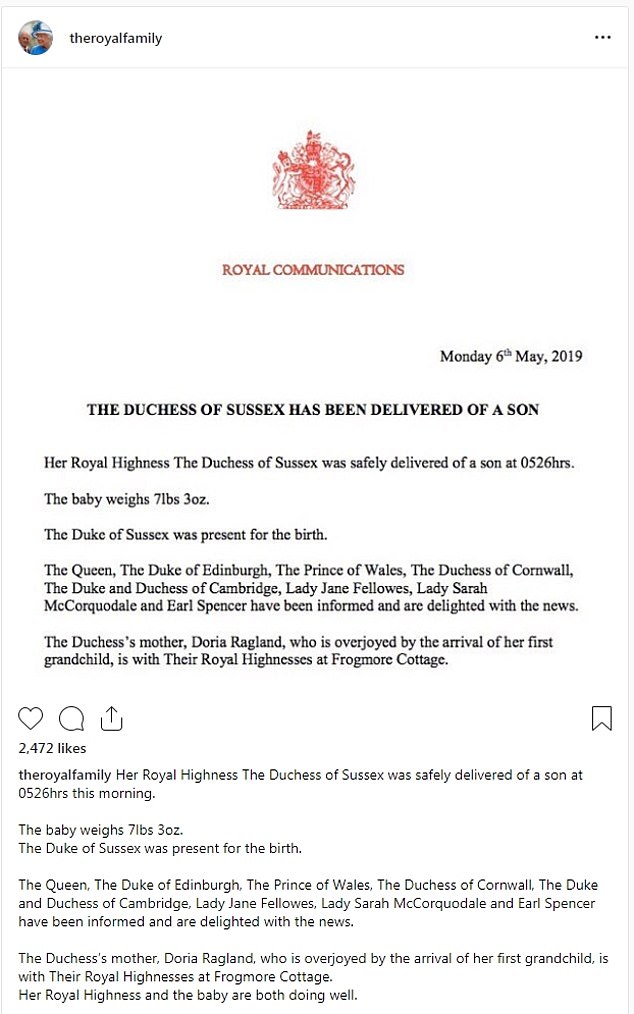 «Η Δούκισσα του Σάσεξ γέννησε αγόρι στις 05.26 τοπική ώρα (07.26 ώρα Ελλάδας) ανακοίνωσαν τα Ανάκτορα. Το μωρό έχει βάρος περίπου 3,3 κιλά. Ο Δούκας του Σάσεξ ήταν παρών στον τοκετό».