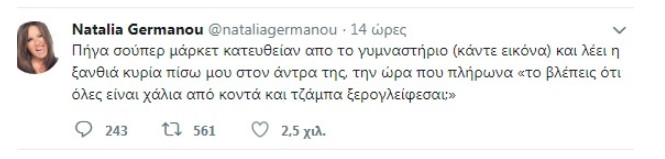 Η παρουσιάστρια έγραψε στο Twitter κάτι που της συνέβη, ή μάλλον κάτι που άκουσε στο σούπερ μάρκετ. Και αφορούσε την ίδια την Ναταλία Γερμανού. Η ατάκα που έγραψε στο Twitter χθες το βράδυ, προκάλεσε αίσθηση και συζητήθηκε με πολύ πολύ χιούμορ. Η παρουσιάστρια, άλλωστε, έχει δείξει πόσο ακομπλεξάριστη είναι μιλώντας ανοιχτά για τα πάντα.