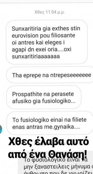 Ένας χρήστης από τα social media έγραψε στον ηθοποιό: «Συγχαρητήρια για εχθές στην Eurovision που φιλιόσαντε άντρες και έλεγες η αγάπη δεν έχει όρια… όχι συγχαρητήρια. Θα έπρεπε να ντρέπεσαι. Προσπαθείτε να περάσετε (το) αφύσικο για φυσιολογικό… Το φυσιολογικό είναι να φιλιέται ένας άντρας με γυναίκα…»