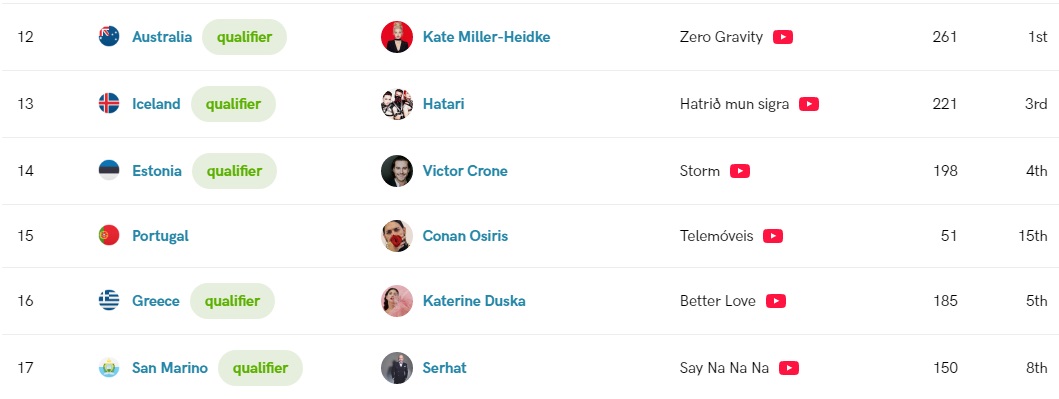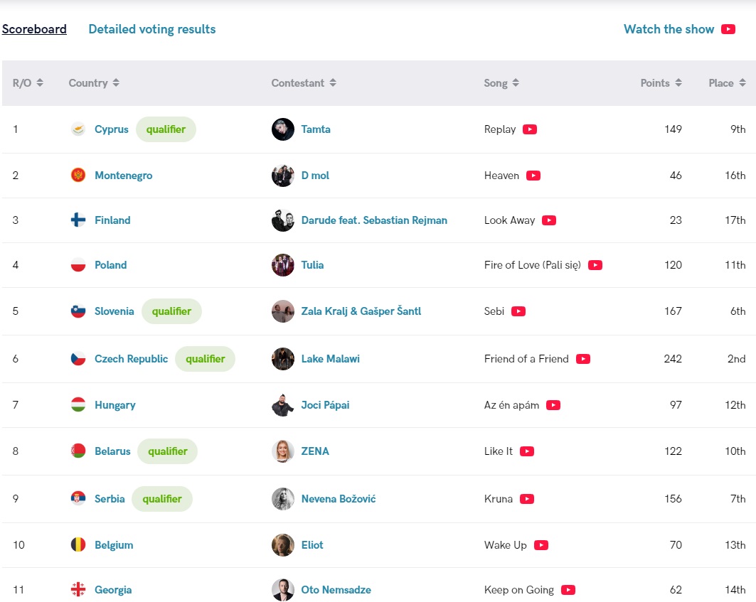 Σύμφωνα με τα επίσημα αποτελέσματα της EBU η Κατερίνα Ντούσκα τερμάτισε στην 5η θέση και η Τάμτα στην 9η! Αποδεικνύεται, λοιπόν, ότι για τις δύο συμμετοχές ο δρόμος δεν ήταν καθόλου εύκολος. Πρώτη στον ημιτελικό ήρθε η Αυστραλία.