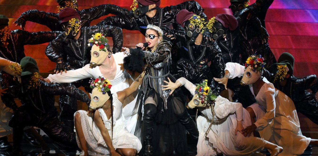 Η Μαντόνα για τη βραδιά της Eurovision επέλεξε να φορέσει έναν μαύρο χιτώνα για να ερμηνεύσει τη διαχρονική της επιτυχία «Like a Prayer». Στη συνέχεια, όμως, παρουσιάζοντας το νέο της τραγούδι «Future» επέλεξε μία πιο κυβερνοπάνκ εμφάνιση, με ένα δερμάτινο κορμάκι, με τους χαρακτηριστικούς κώνους του αγαπημένου της σχεδιαστή και φίλου Ζαν-Πολ Γκοτιέ, που την τίμησε, εξάλλου, με την παρουσία του. Και η ενδυματολογική της πρόταση «έκλεινε» με την «Βασίλισσα της Ποπ» να φοράει το στέμμα της.