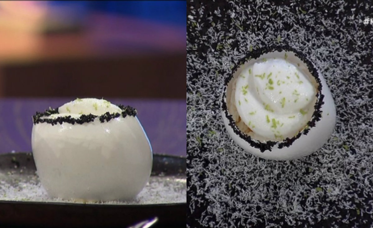Το απ’ έξω κομμάτι είναι ζάχαρη που φουσκώνεται με μια τρόμπα χεριού κι έπειτα με δύο καυτά τσέρκια πρέπει να κοπεί πάνω και κάτω. Μέσα είχε κρέμα λεμόνι, πανακότα καρύδας, μαρέγκα και σορμπέ καρύδας και πράσινου λεμονιού.