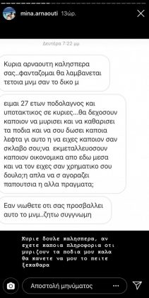 «Κυρία Αρναούτη καλησπέρα σας. Φαντάζομαι θα λαμβάνετε τέτοια μηνύματα σαν το δικό μου. Είμαι 27 ετών ποδολάγνος και υποτακτικός σε κυρίες. Θα δεχόσουν κάποιον να μυρίσει και να καθαρίσει τα πόδια και να σου δώσει κάποια λεφτά για αυτό η να έχει κάποιον σαν σκλάβο σου; Να εκμεταλλευόσουν κάποιον οικονομικά από εδώ ,μέσα και να τον είχες σαν χρηματικό σου δούλο; Η απλά να σε αγοράζει παπούτσια η άλλα πράγματα. Εάν νιώθετε ότι σας προσβάλλει αυτό το μήνυμα. Ζητώ συγγνώμη.», ανέφερε ο follower στο μήνυμά του.