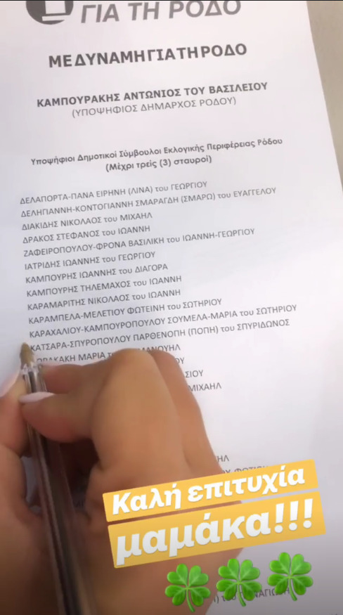 Η Κωνσταντίνα Σπυροπούλου, που είναι λάτρης των μέσων κοινωνικής δικτύωσης, φροντίζει να ενημερώνει τακτικά τους διαδικτυακούς της φίλους για τις κινήσεις της. Και όπως ήταν λογικό, δεν θα παρέλειπε να «διαφημίσει» ακόμη μία φορά την υποψηφιότητα της μητέρας της, αναρτώντας φωτογραφίες που την δείχνουν από την ψηφοφορία της σε εκλογικό τμήμα της Ρόδου με την λεζάντα «Go Mommy».