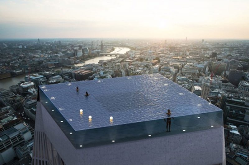 Στο Λονδίνο λοιπόν, οι ενδιαφερόμενοι θα έχουν τη δυνατότητα να απολαύσουν τις βουτιές τους στην πρώτη πισίνα υπερχείλισης 360°. Τα πρώτα σχέδιά έχουν δοθεί στη δημοσιότητα και απεικονίζουν μια πισίνα με διάφανα τοιχώματα και διάφανο πάτο, σε ύψος 220 μ. στον τελευταίο όροφο ενός ουρανοξύστη. Το υλικό που θα χρησιμοποιηθεί στην κατασκευή της πισίνα θα είναι το ακριλικό επιτρέποντας με αυτόν τον τρόπο να αντανακλά το φως και να φαίνεται απόλυτα διαφανής.