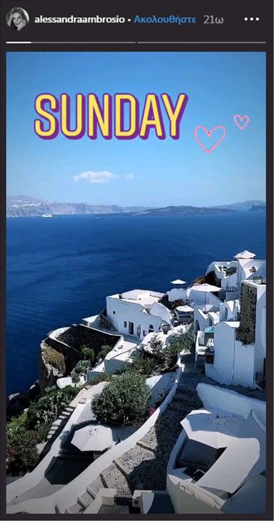 Όπως φαίνεται βρίσκεται στην Οία, ενώ αν κρίνουμε από τις καρδούλες με τις οποίες συνοδεύει όλες τις αναρτήσεις της για την Σαντορίνη, το νησί της έχει κλέψει την καρδιά!