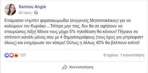 Οπως υποστηρίζει η γνωστή αοιδός με ανάρτησή της στο facebook πρόκειται για «ντιμπέιτ-φαρσοκωμωδία» υιοθετώντας τα όσα ανέφεραν τα τρολ του ΣΥΡΙΖΑ για «συγγενείς Μητσοτακέικου».