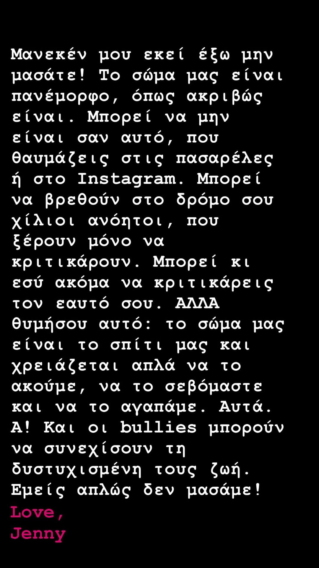 Μεταξύ των σχολίων που δέχτηκε κάτω από τη φωτογραφία της υπήρξαν και κάποια αρνητικά που αναφερόντουσαν στη δομή του σώματός της. Η δημοσιογράφος και ραδιοφωνική παραγωγός δεν μπορούσε να αφήσει έτσι αυτή την κατάσταση και έτσι αποφάσισε να τοποθετηθεί δημόσια. Η Τζένη Μελιτά με ένα μακροσκελές μήνυμα απευθύνεται σε όλες τις γυναίκες και ζητά να αγαπούν το σώμα τους όπως ακριβώς είναι.