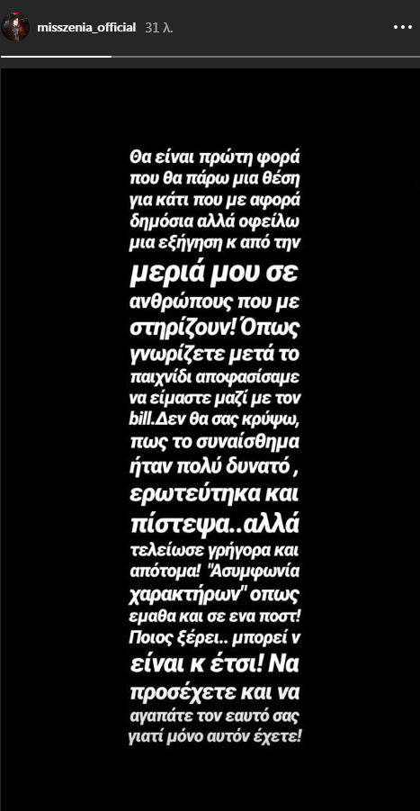 Ωστόσο, η σχέση τους δεν κράτησε και πολύ, καθώς, ο Bill Σαντριάς και η Ζένια Σολδάτου, έκαναν ο καθένας ξεχωριστά μία ανάρτηση στον προσωπικό τους λογαριασμό στο Instagram, όπου γνωστοποίησαν το χωρισμό τους. Πλέον οι πρώην παίκτες του ριάλιτι αγάπης, τράβηξαν ξεχωριστούς δρόμους ζωής.