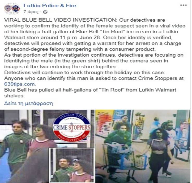 Σάλο έχει προκαλέσει ένα βίντεο που έχει γίνει viral και δείχνει μία νεαρή κοπέλα σε σούπερ μάρκετ να ανοίγει ένα οικογενειακό παγωτό Blue Bell, να το γλείφει και μετά να το ξαναβάζει κλειστό στο ράφι.