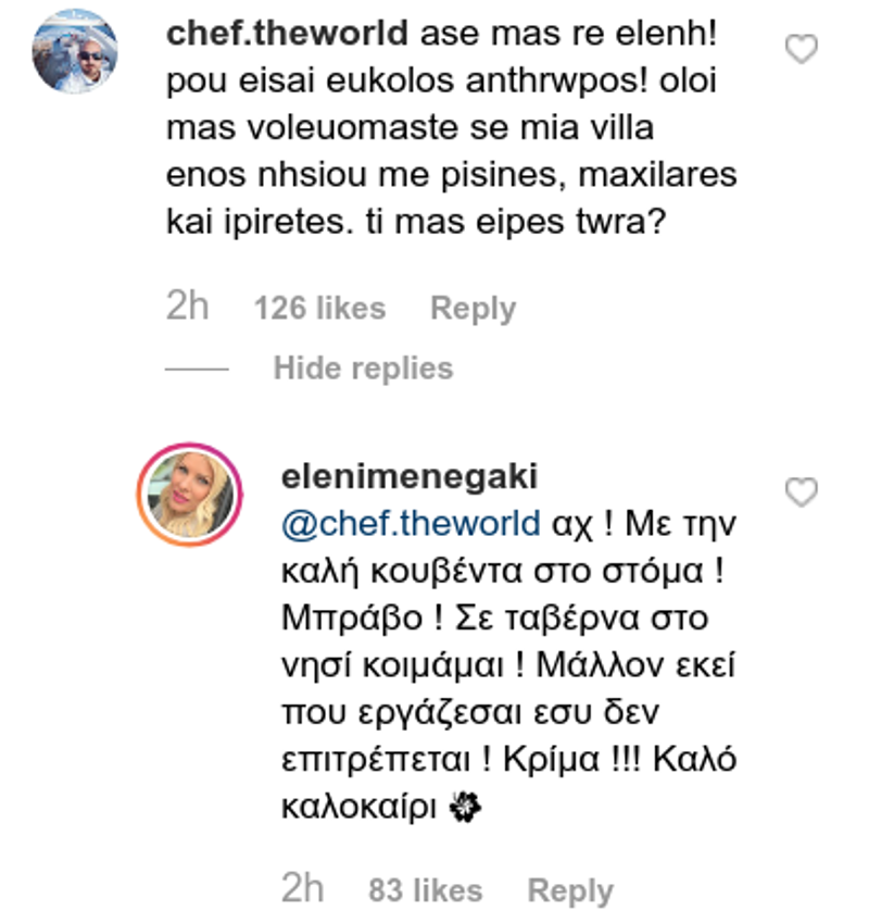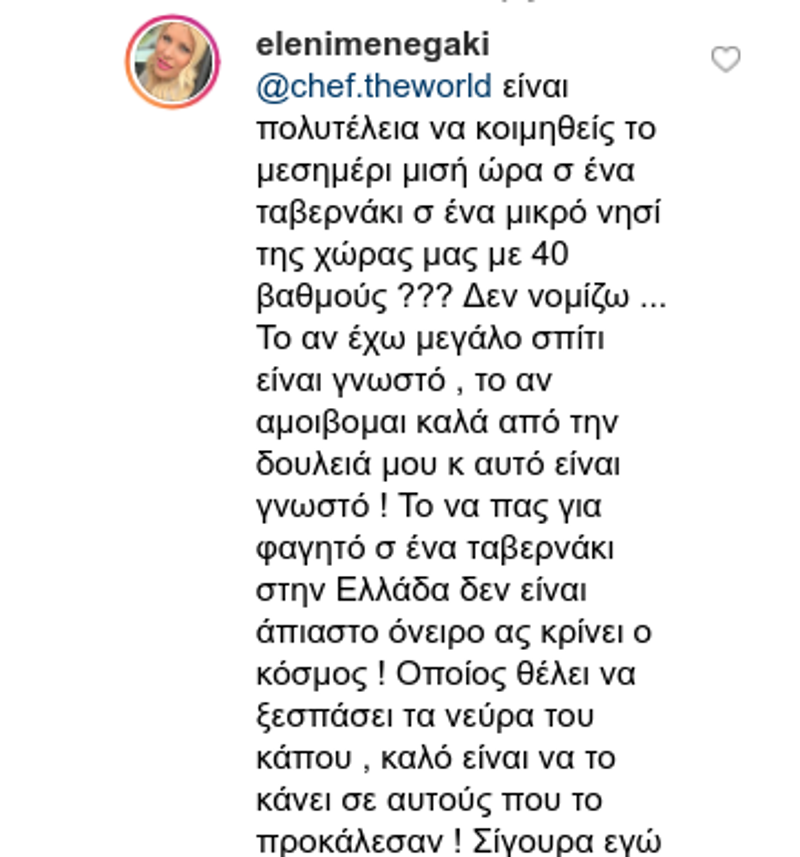 Η Ελένη Μενεγάκη απάντησε για ακόμη μία φορά, σχολιάζοντας: «είναι πολυτέλεια να κοιμηθείς το μεσημέρι μισή ώρα σ ένα ταβερνάκι σ ένα μικρό νησί της χώρας μας με 40 βαθμούς??? Δεν νομίζω … Το αν έχω μεγάλο σπίτι είναι γνωστό, το αν αμοιβομαι καλά από την δουλειά μου κ αυτό είναι γνωστό! Το να πας για φαγητό σ ένα ταβερνάκι στην Ελλάδα δεν είναι άπιαστο όνειρο ας κρίνει ο κόσμος! Οποίος θέλει να ξεσπάσει τα νεύρα του κάπου , καλό είναι να το κάνει σε αυτούς που το προκάλεσαν! Σίγουρα εγώ δεν είμαι μέσα σε αυτούς! Καλό καλοκαίρι με ηρεμία, αγάπη, υγεία και καθαρό μυαλό ».