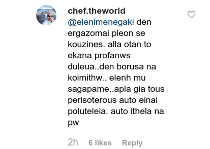Η συζήτηση, όμως, δεν σταμάτησε εκεί, αφού ο ακόλουθός της, σχολίασε ξανά: «Δεν εργάζομαι πλέον σε κουζίνες, αλλά όταν το έκανα προφανώς δούλευα, δεν μπορούσα να κοιμηθώ. Ελένη μου σ’ αγαπάμε, απλά για τους περισσότερους αυτό είναι πολυτέλεια. Αυτό ήθελα να πω.».