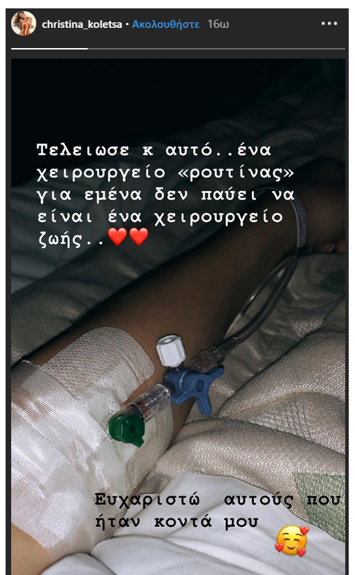 «Τελείωσε και αυτό. Ένα χειρουργείο ρουτίνας για εμένα δεν να είναι παύει ένα χειρουργείο ζωής. Ευχαριστώ αυτούς που ήταν κοντά μου», έγραψε χαρακτηριστικά η Χριστίνα Κολέτσα χωρίς όμως να αποκαλύπτει το λόγο της εισαγωγής της.