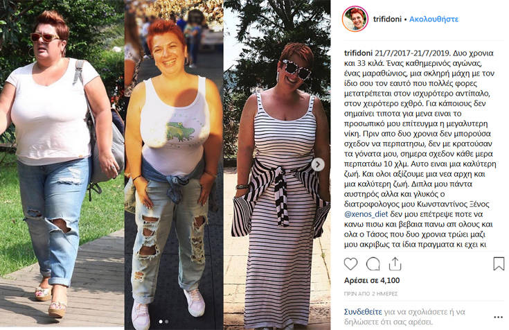 «21/7/2017-21/7/2019. Δυο χρόνια και 33 κιλά. Ένας καθημερινός αγώνας, ένας μαραθώνιος, μια σκληρή μάχη με τον ίδιο σου τον εαυτό που πολλές φορές μετατρέπεται στον ισχυρότερο αντίπαλο, στον χειρότερο εχθρό. Για κάποιους δεν σημαίνει τίποτα για μένα είναι το προσωπικό μου επίτευγμα η μεγαλύτερη νίκη. Πριν από δυο χρόνια δεν μπορούσα σχεδόν να περπατήσω, δεν με κρατούσαν τα γόνατα μου, σήμερα σχεδόν κάθε μέρα περπατάω 10 χλμ. Αυτό είναι μια καλύτερη ζωή. Και όλοι αξίζουμε μια νέα αρχή και μια καλύτερη ζωή. Διπλά μου πάντα αυστηρός αλλά και γλυκός ο διατροφολόγος μου Κωνσταντίνος Ξένος, δεν μου επέτρεψε ποτέ να κάνω πίσω και βέβαια πάνω απ όλους και όλα ο Τάσος που δυο χρόνια τρώει μαζί μου ακριβώς τα ίδια πράγματα κι έχει κι αυτός μια φορά την εβδομάδα “ελεύθερο” χωρίς βέβαια να το χρειάζεται…Και ναι νιώθω πλέον υγιής και δυνατή… νικήτρια μιας καλύτερης ζωής», έγραψε χαρακτηριστικά.