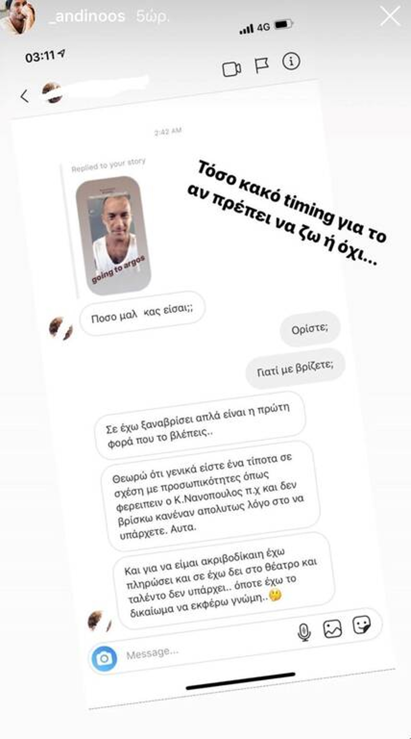 Ο Αντίνοος Αλμπάνης δημοσιεύοντας τη συνομιλία σε story, αρκέστηκε να σχολιάσει: «Τόσο κακό timing για το αν πρέπει να ζω ή όχι».