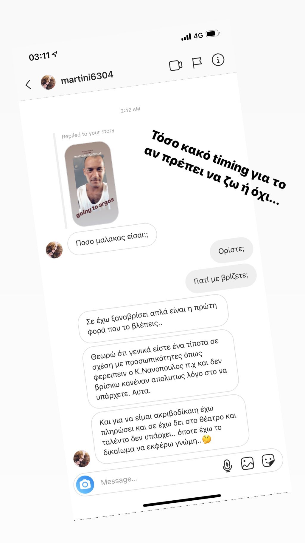Αυτή τη φορά, ο Αντίνοος Αλμπάνης, δημοσίευσε σε ένα story, μια υβριστική επίθεση που δέχτηκε από μία κοπέλα. Ο διάλογος τους είχε ως εξής: