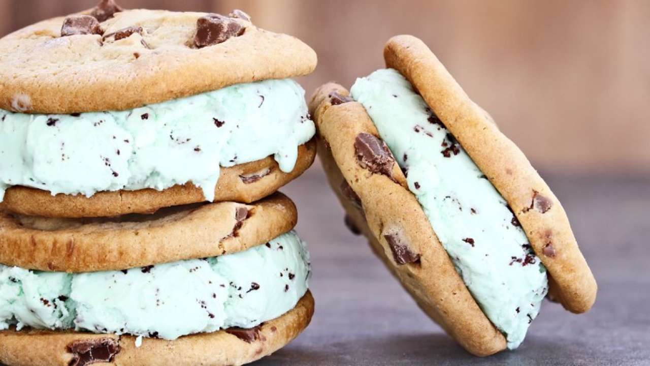 6. Απλώνουμε πάνω από την επιφάνεια του μείγματος τα υπόλοιπα μπισκότα το ένα δίπλα στο άλλο και τυλίγουμε με τη μεμβράνη που προεξέχει. Τοποθετούμε το σκεύος στην κατάψυξη για 4-5 ώρες περίπου μέχρι να σφίξει πολύ καλά το παγωτό.